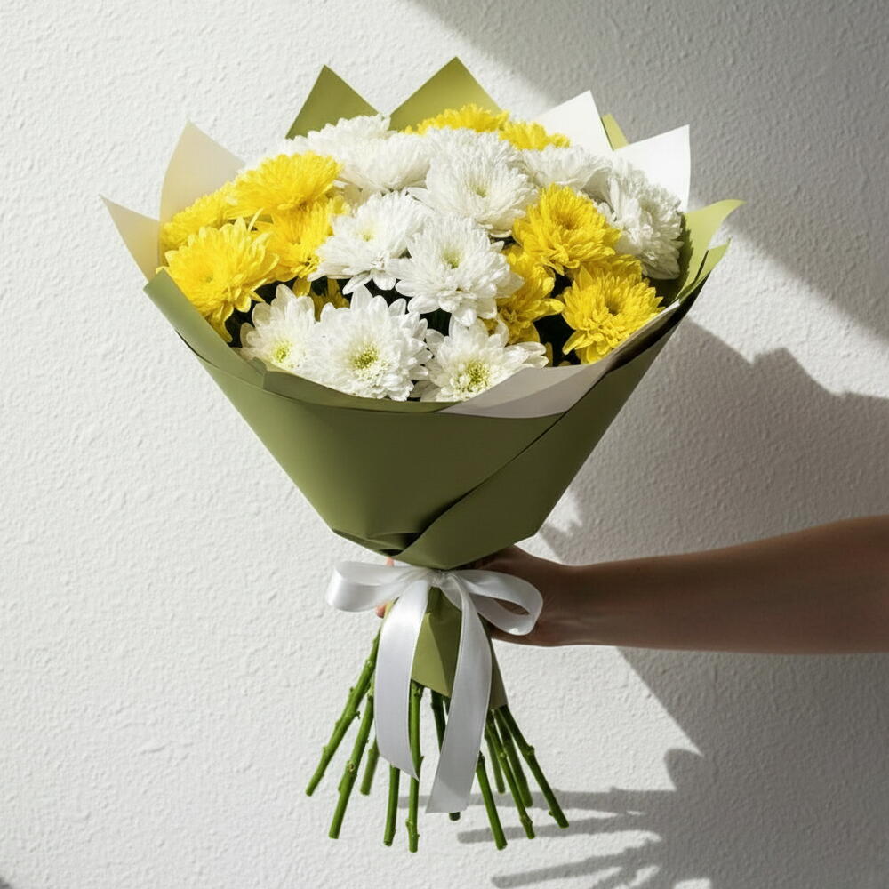 Un arreglo fresco y alegre de 11 crisantemos amarillos y blancos, que combina luminosidad y pureza. Ideal para cumpleaños, felicitaciones, regalos de pronta recuperación, y decoración del hogar. Sencillo, vivaz y bellamente envuelto.