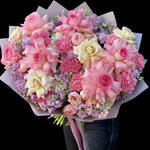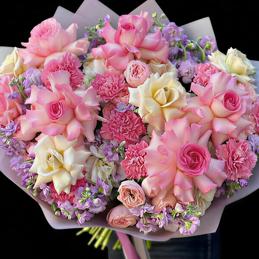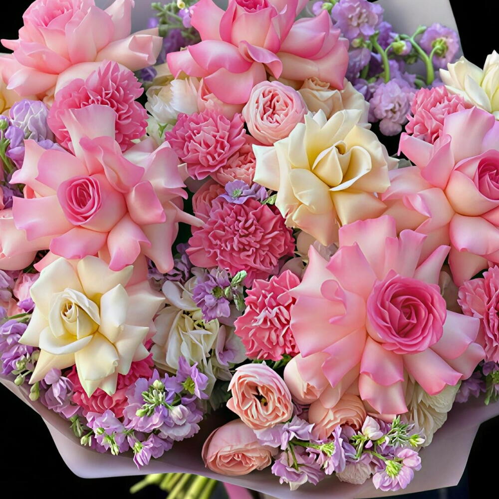claveles rosas - 20 ud. funda rosa - 10 ud. julleita rosa - 10 ud. esperanza blanca - 10 ud. esperence rosa - 10 ud. micheola púrpura - 10 ud.