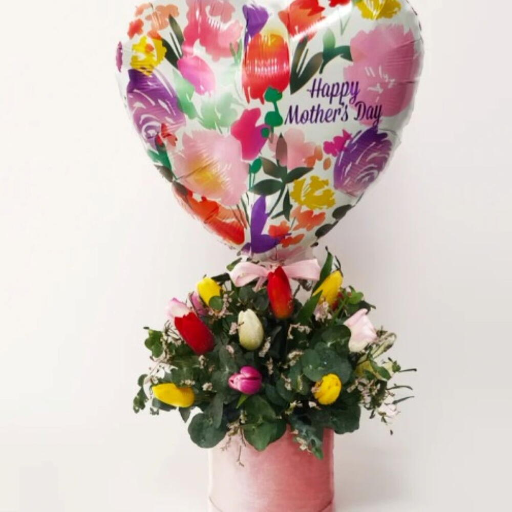 Tulipanes para el Día de la Madre Arreglo en caja con globos