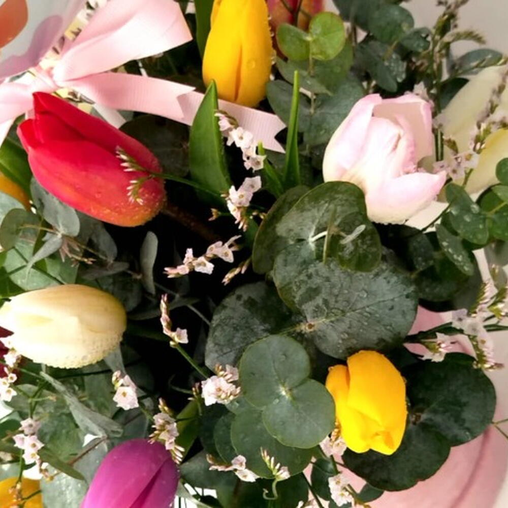 Eucalyptus - 5 ud. Limonium - 3 ud. colores surtidos de tulipán - 15 ud.