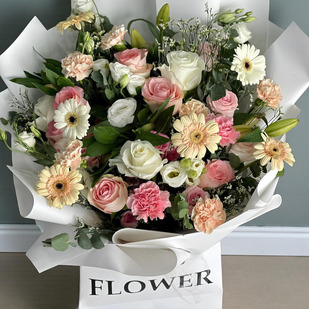 Eucalyptus - 4 ud. Gypsophila - 3 ud. rose - 10 ud. claveles rosas - 3 ud. white lisianthus - 3 ud. rosa bebé - 5 ud. gerbera melocotón - 3 ud. capullos de lirio - 2 ud.
