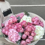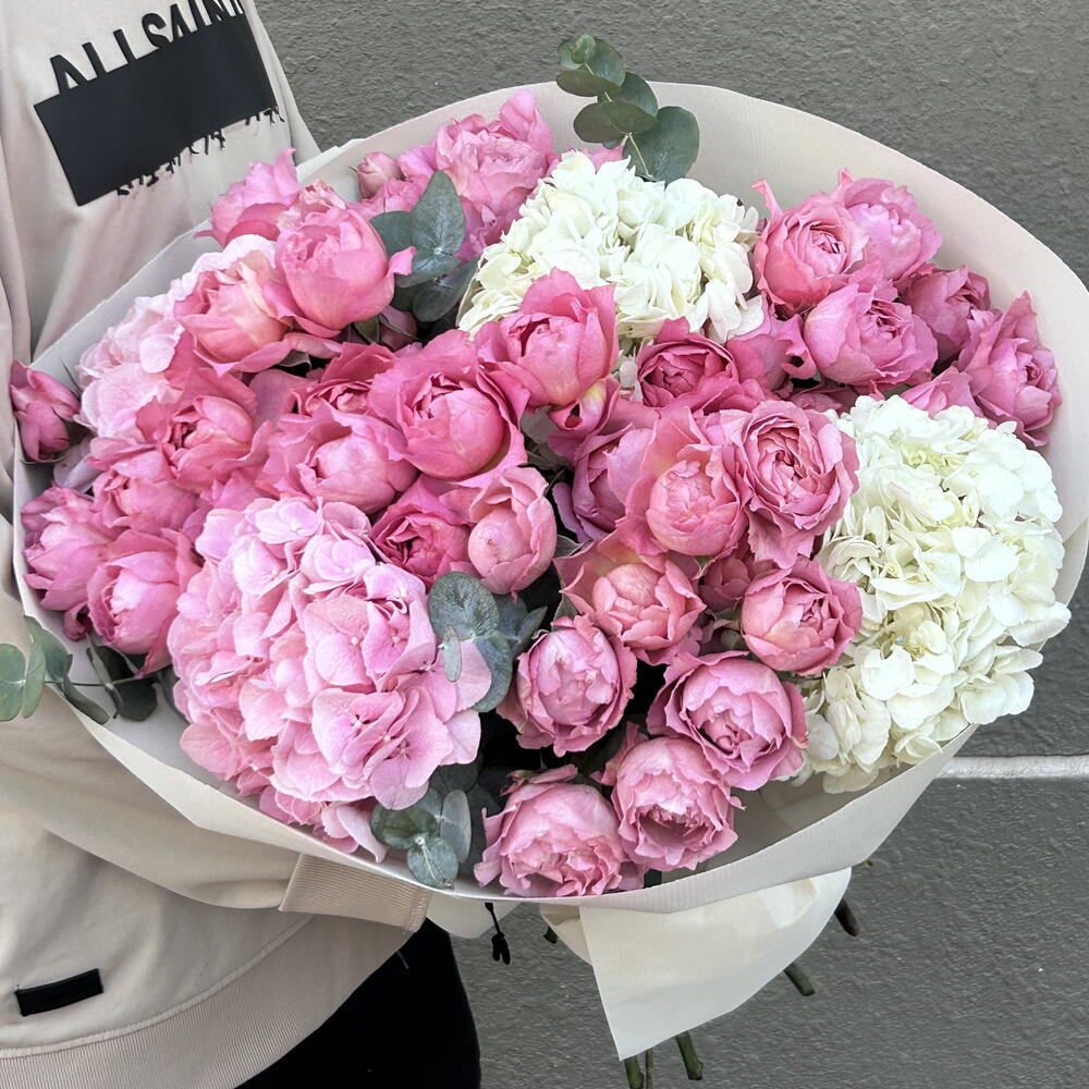 Eucalyptus - 4 ud. hortensias rosadas - 2 ud. wrapping paper - 4 ud. white hydrangea - 2 ud. rosas spray julietta rosa - 7 ud.