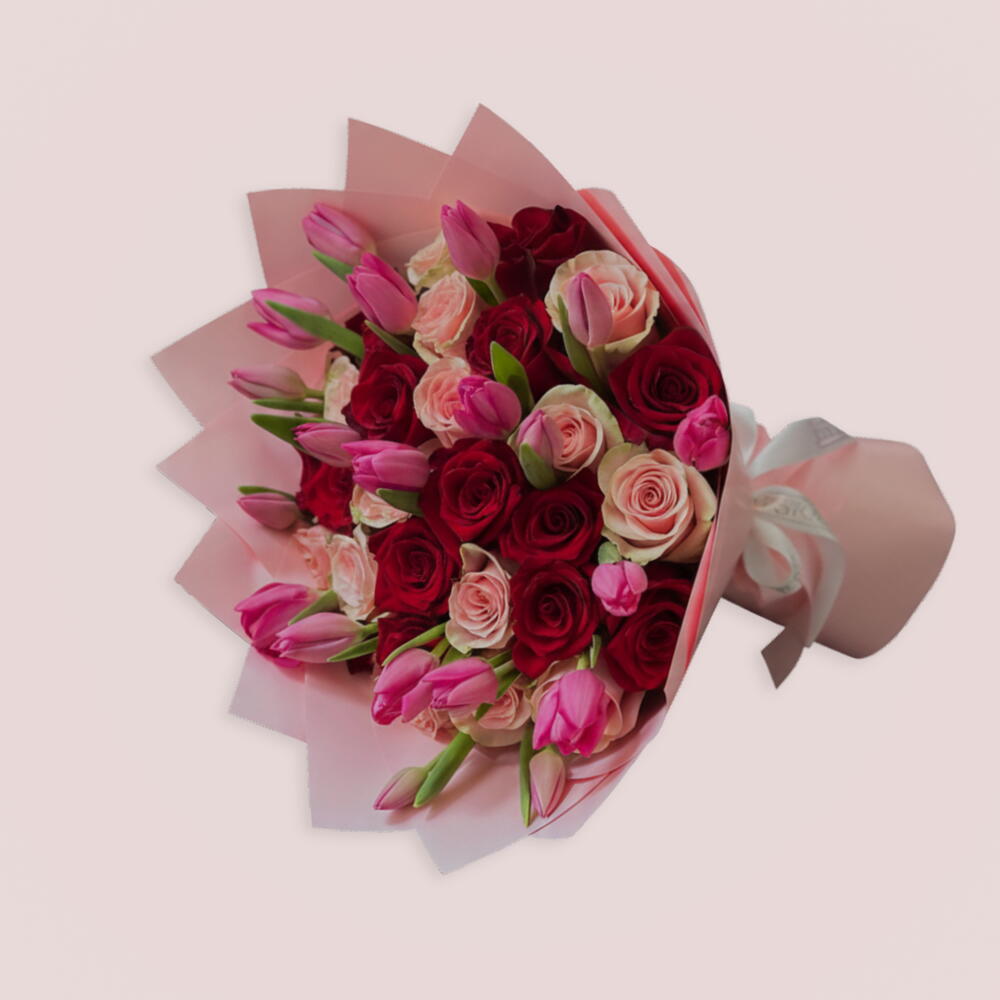 10 tallos de tulipán rosa oscuro, 3 tallos de rosa roja, 3 tallos de rosa rosada,