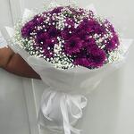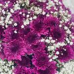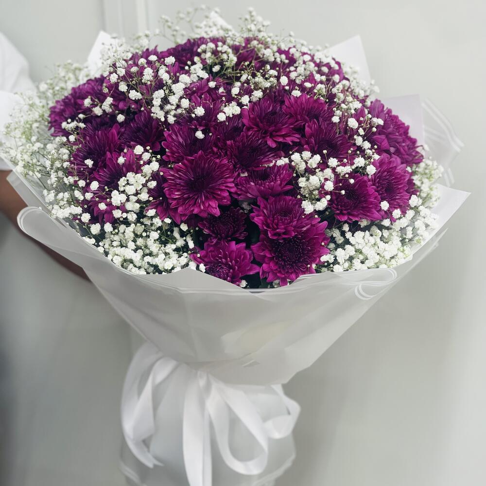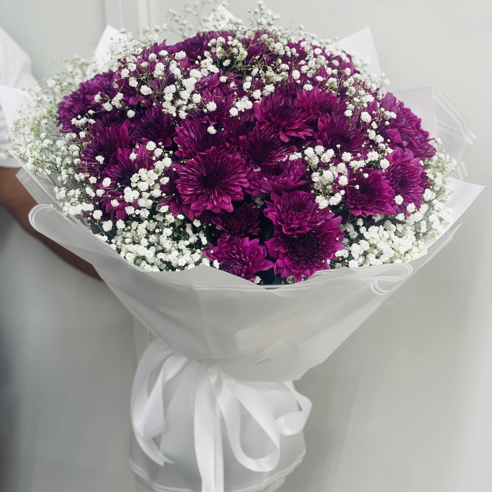 Gypsophila - 5 ud. papel de regalo blanco - 10 ud. cinta - 1 ud. crisantemo púrpura - 15 ud.
