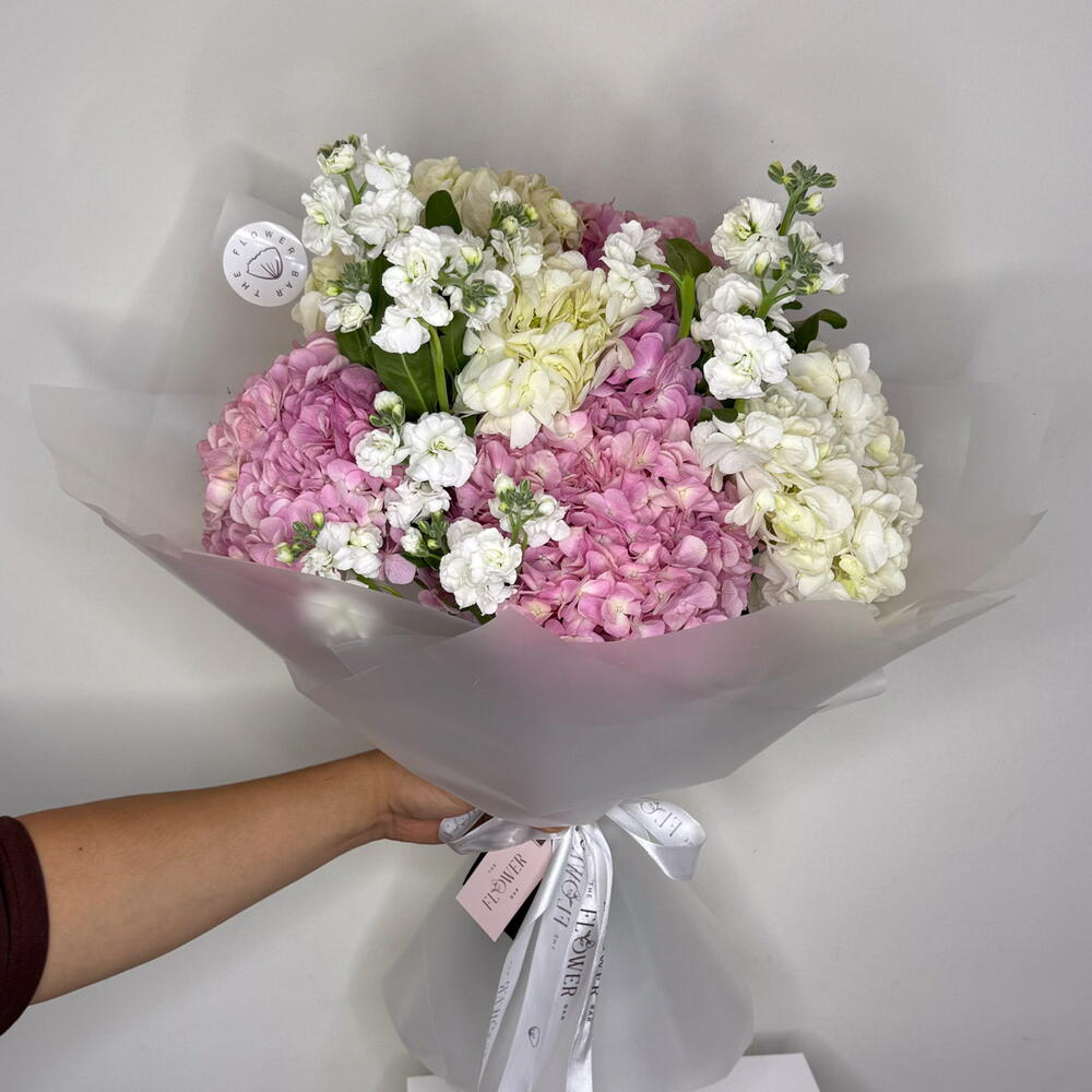 Este especial de floristería, cuidadosamente seleccionado, presenta una exquisita selección de flores, elegantemente envueltas para crear un espectáculo floral cautivador. Presenta una delicada combinación de una hortensia rosa y tres hortensias blancas, que contrastan con elegancia con tres fragantes matthiolas blancas. Todas estas hermosas flores están cuidadosamente arregladas y empaquetadas en una elegante bolsa de la marca. Este elegante arreglo floral es perfecto para realzar cualquier ocasión o expresar sentimientos sinceros a sus seres queridos.