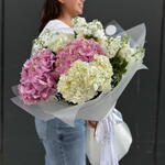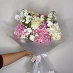 Wrapping - 1 ud. hydrangea pink - 3 ud. hydrangea white - 3 ud. matthiola blanca - 3 ud. bolsa de marca - 1 ud.
