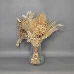 Vase - 1 ud. hortensia preservada - 1 ud. craspedia (botones amarillos) - 3 ud. cabezas secas de cardo - 2 ud. lagurus ovatus (colas de conejo) - 3 ud. tallos de pampas secas - 3 ud. tallos de ruscus blanqueados - 5 ud. tallos secos de avena y trigo - 3 ud.