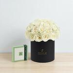 Este refinado arreglo, una impresionante colección de rosas blancas puras complementada con chocolates de primera calidad, transmite serenidad, admiración y sentimientos sinceros con una belleza y un gusto sin esfuerzo.