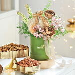 Da la bienvenida a la bondad acompañada de un toque de amor floral. El exuberante surtido es una mezcla de abundancia festiva y delicias conscientes elaboradas a la perfección - almendras tostadas saladas, anacardos con pimienta negra, tuberosas, alstroemerias rosas, flores de peonía doradas secas y springeri.