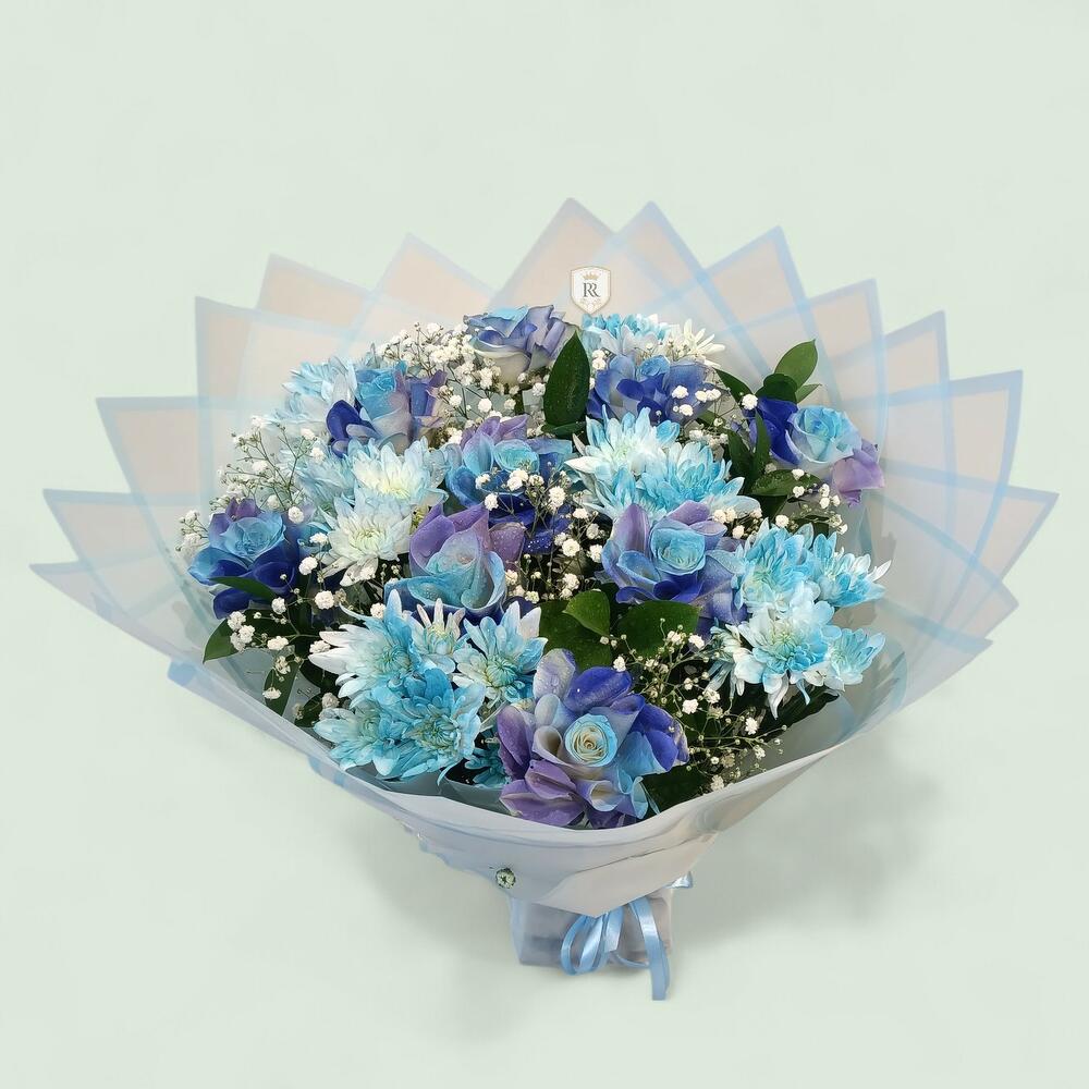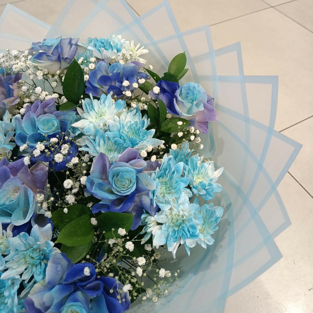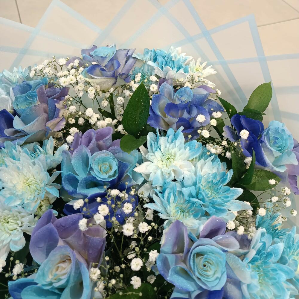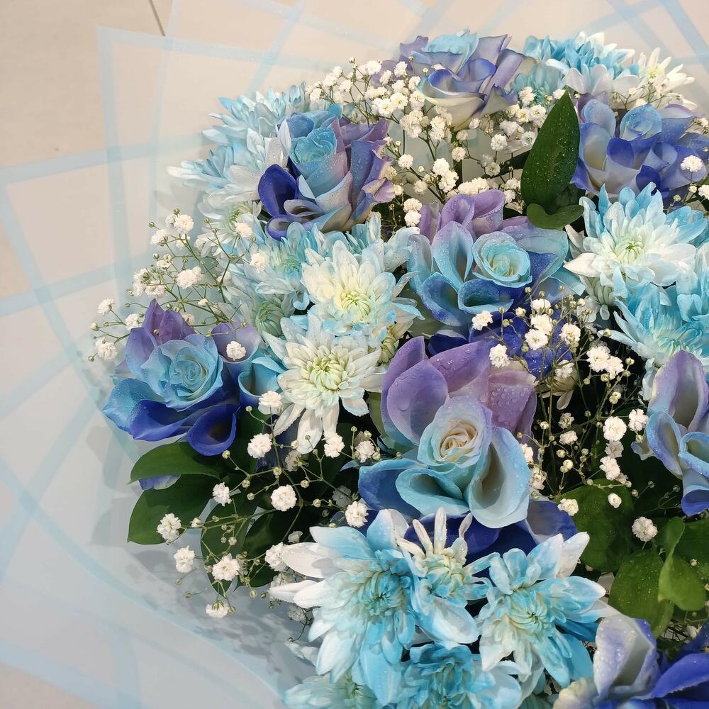 Un cautivador ramo que muestra una variedad de flores en tonos azules, incluyendo rosas en varios tonos de azul y lavanda, crisantemos y delicada paniculata, bellamente arreglado y envuelto en papel azul claro y blanco con una cinta a juego. Evoca una sensación de calma y elegancia.