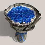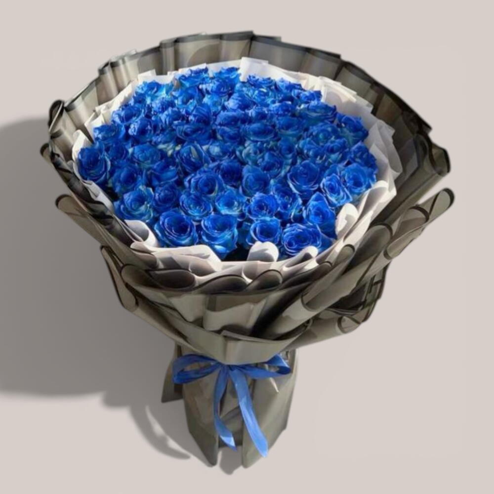 A striking and voluminous bouquet featuring dozens of deep, electric blue roses tightly clustered and encased in a dramatic, sculptural charcoal-grey and white wrap.