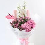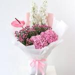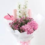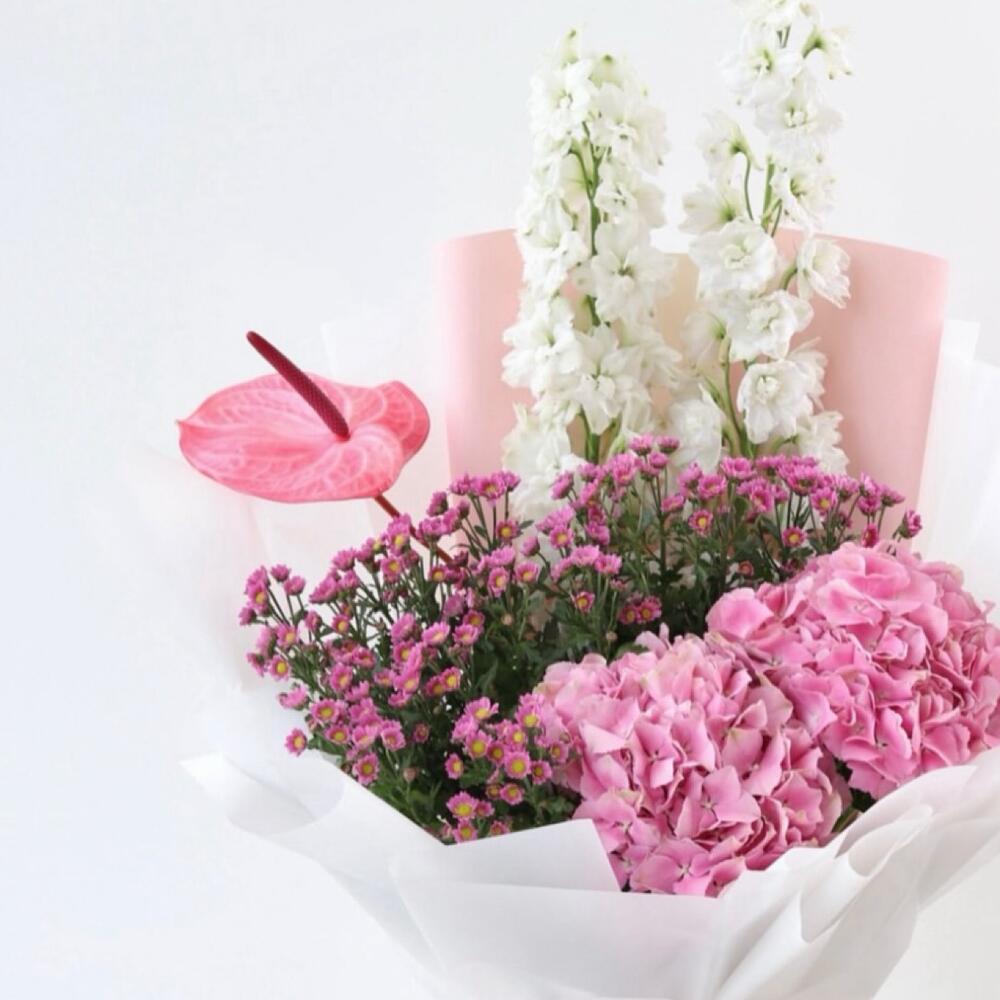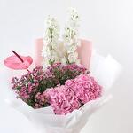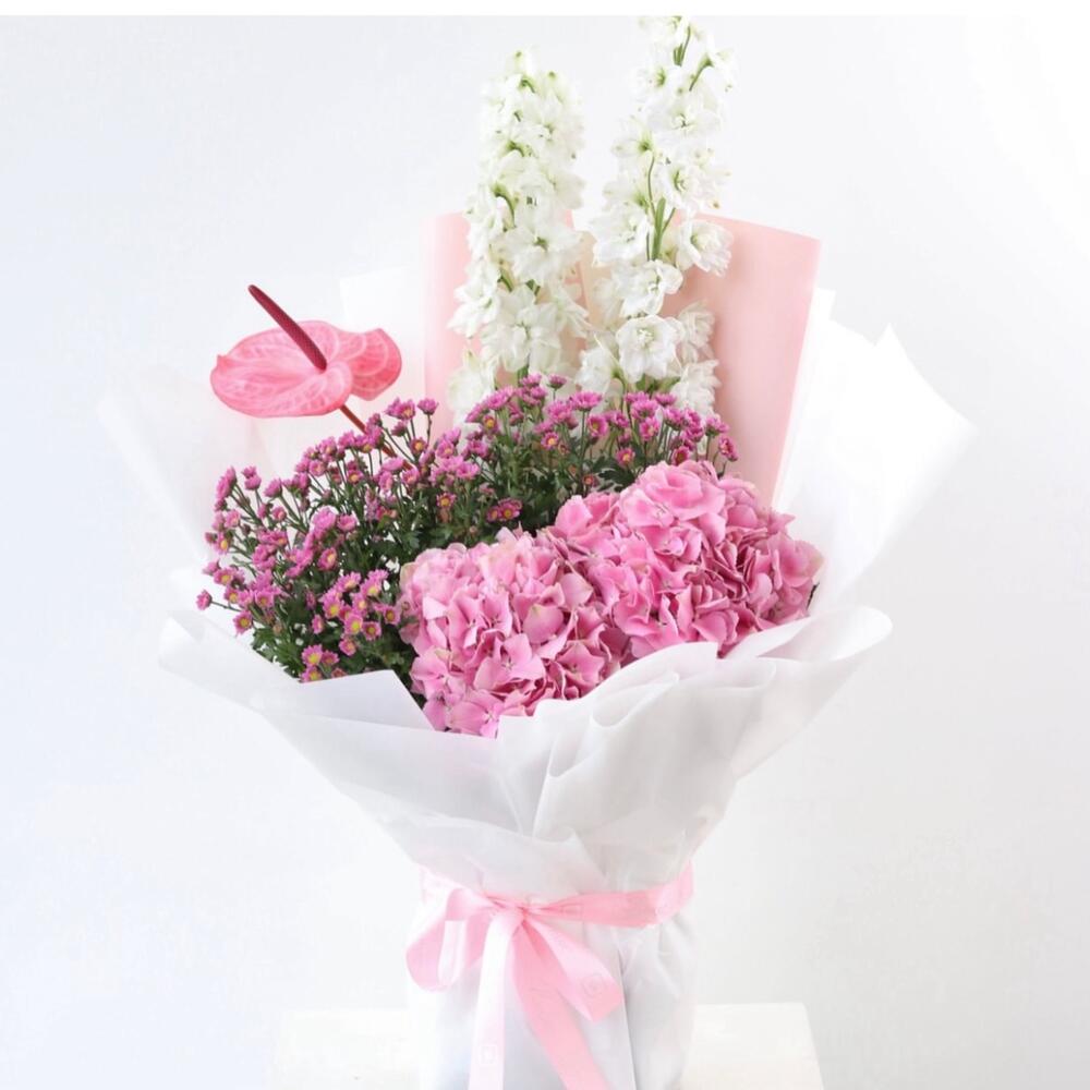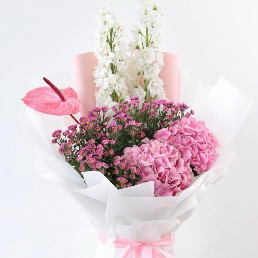 Odessa Bloom 🌸 Composición: • 2 Delphiniums blancos • 1 Anthurium rosa • 2 Hortensias rosas • Flores de cera rosas • Envuelto en papel blanco y rosa, atado con cinta de satén rosa Un ramo delicado y romántico en tonos blancos y rosas. Los delphiniums blancos aportan elegancia, las hortensias rosas aportan un toque exuberante, un solo anturio rosa aporta encanto y las flores de cera rosas aportan delicados toques. Perfecto para: Aniversarios, notas de amor, felicitaciones o para alegrarle el día a alguien. Nota de Majd: «Odessa Bloom captura un momento apacible y estimulante, perfecto para tus seres queridos».