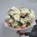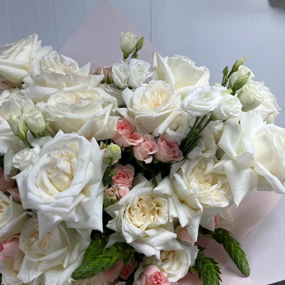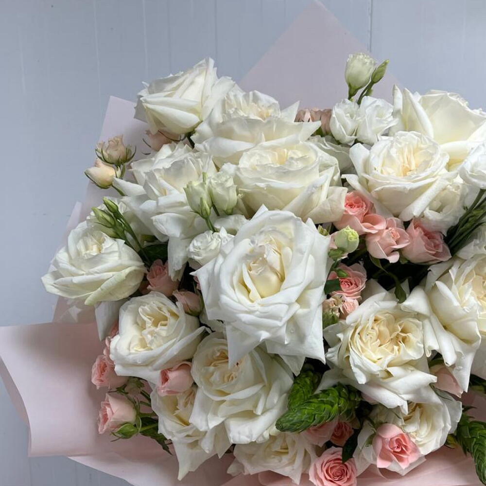 Eustoma white - 10 ud. rosas ohara blancas - 20 ud. rosas baby durazno - 10 ud.
