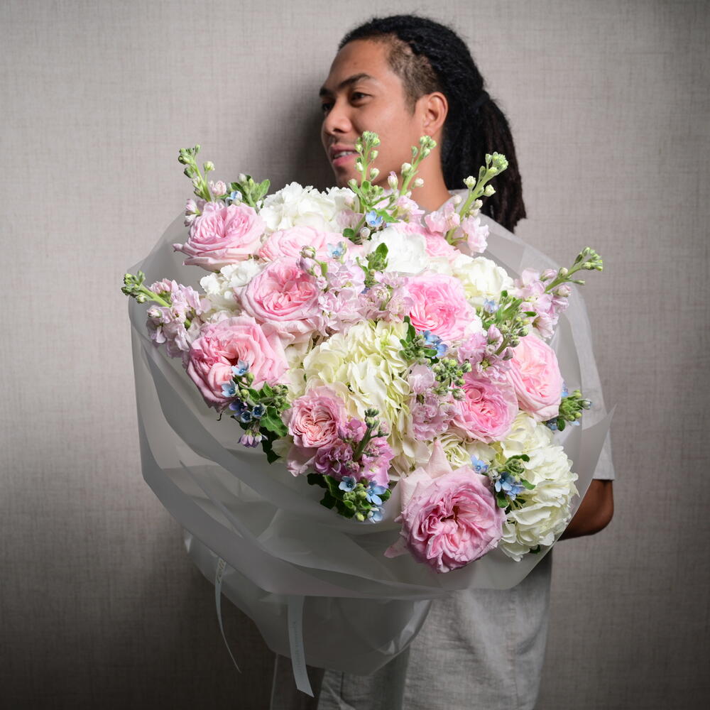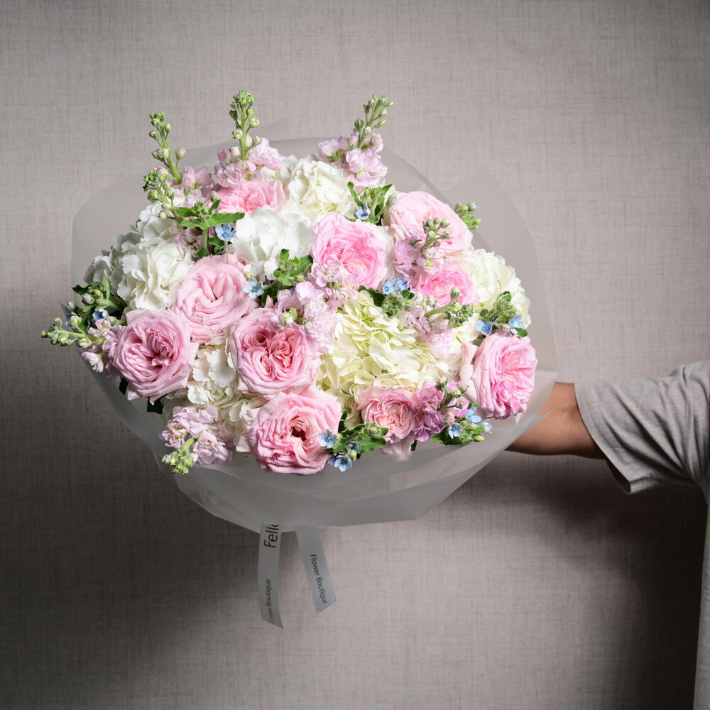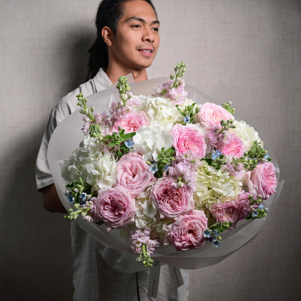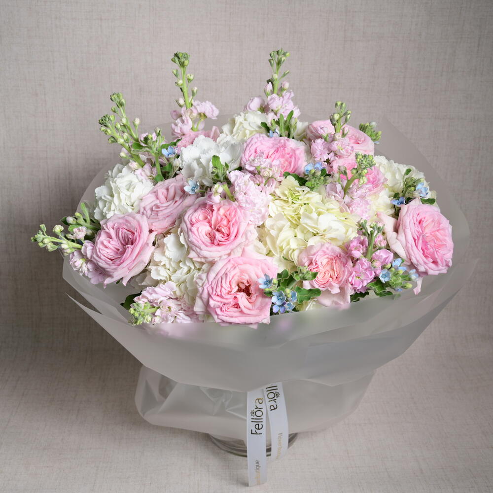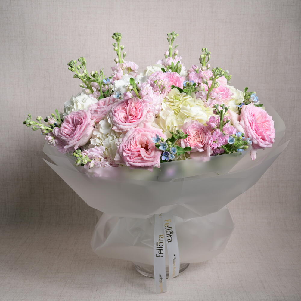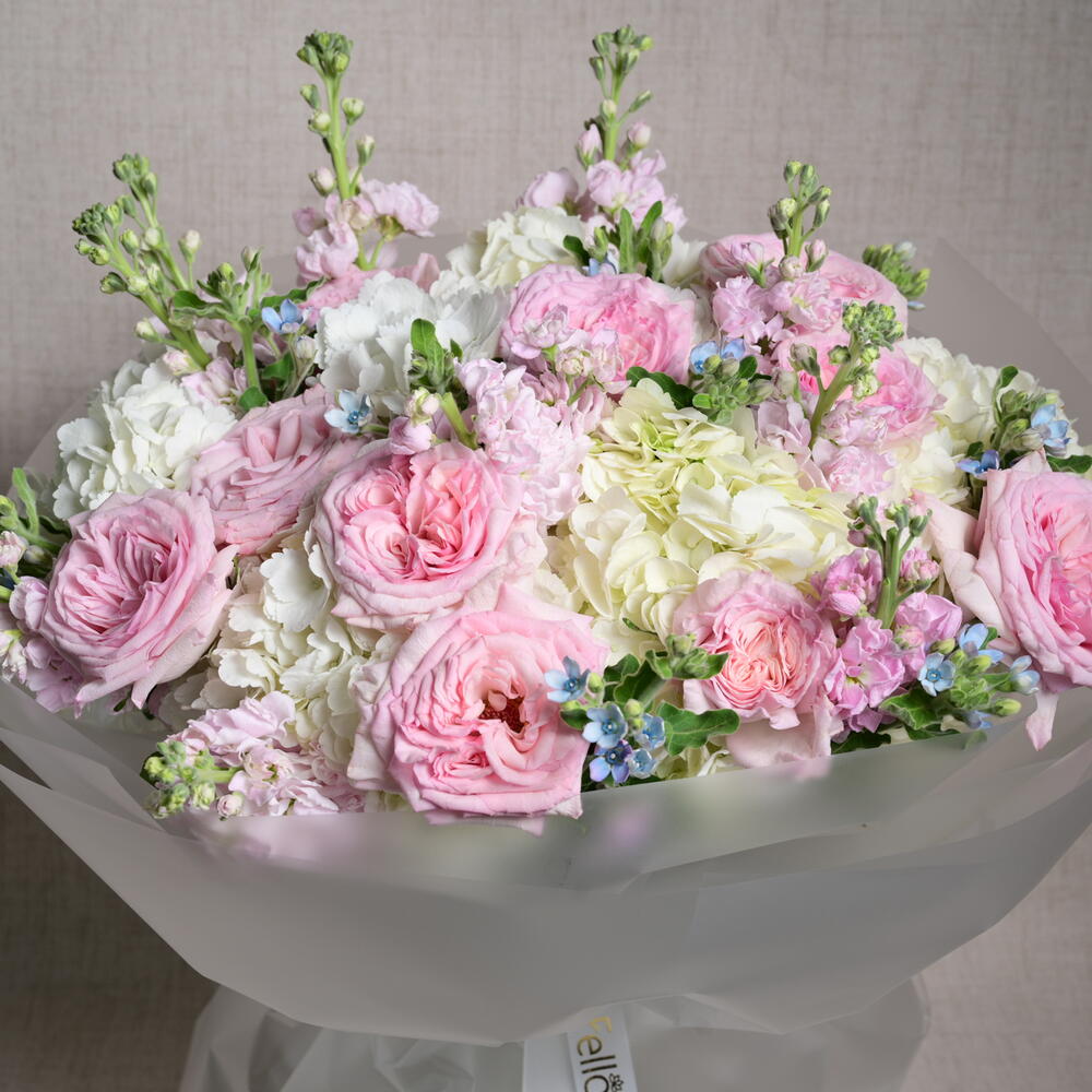 Un arreglo romántico y elegante con 9 rosas Ohara, 9 matthiolas, 9 oxypetalums y 6 hortensias, perfectamente combinado para crear un ramo suave y de ensueño que irradia encanto y sofisticación.