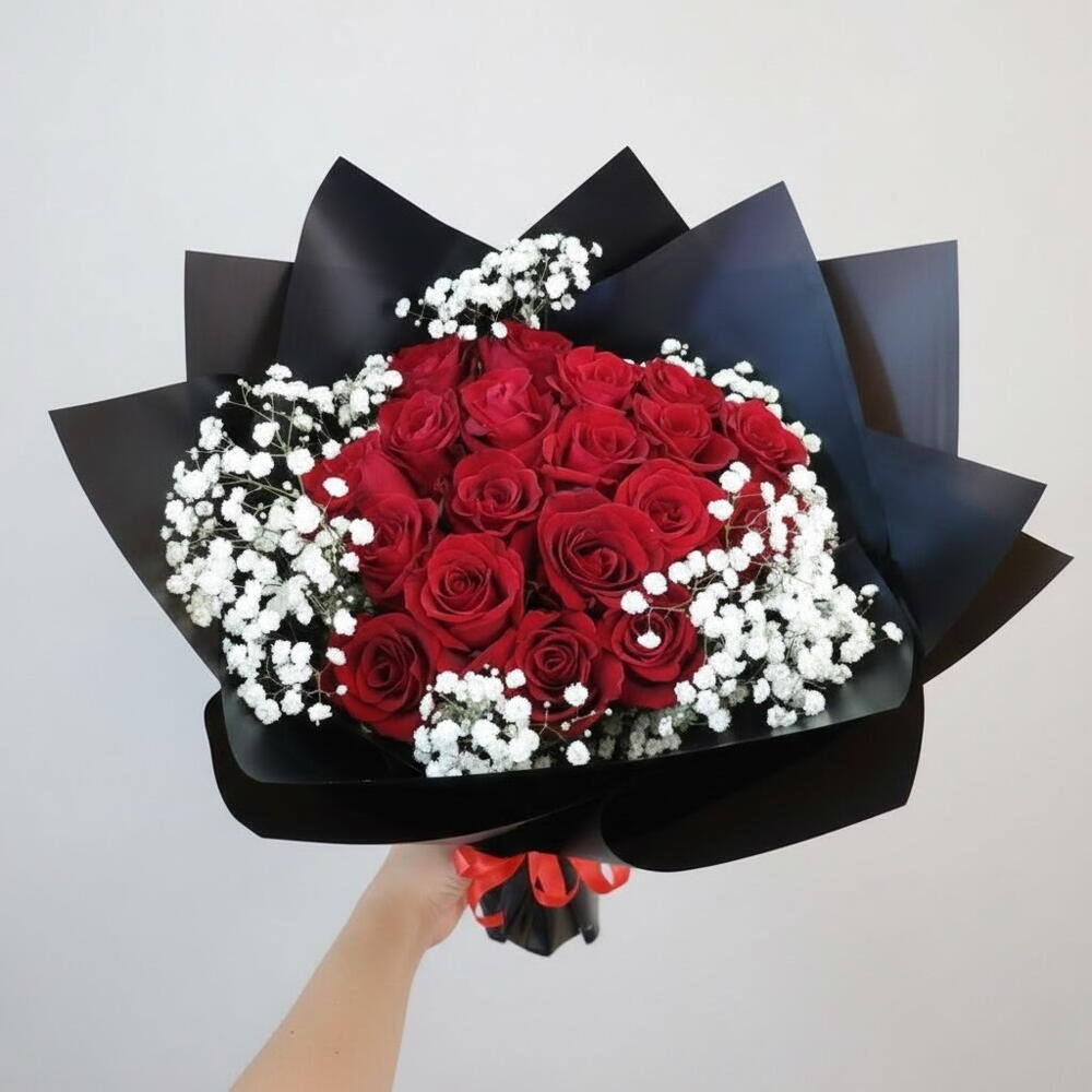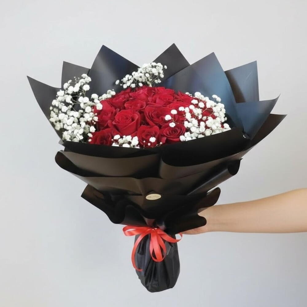 Este impresionante ramo presenta 25 vibrantes rosas rojas, que simbolizan el amor, la pasión y la admiración. Las rosas están bellamente complementadas por delicada gypsophila, añadiendo un toque suave y romántico al conjunto. Envuelto en sofisticado papel de seda negro y dorado, este ramo desprende elegancia y encanto, convirtiéndolo en el regalo perfecto para aniversarios, el Día de San Valentín o cualquier celebración romántica. El llamativo contraste de las rosas rojas con la delicada gypsophila crea un efecto visual impresionante que seguro dejará una impresión duradera. Para su cuidado, asegúrate de cambiar el agua regularmente y recortar los tallos aproximadamente 1 cm cada pocos días para prolongar su frescura. Mantén el ramo en un lugar fresco y fuera de la luz solar directa para asegurar que las rosas duren más.
