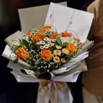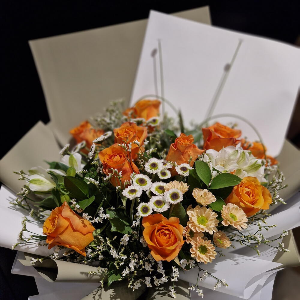 Ruscus - 2 ud. manzanilla - 3 ud. alstroemeria blanca - 3 ud. gypso - 3 ud. rosas naranjas - 10 ud. crisantemo spray melocotón - 4 ud.