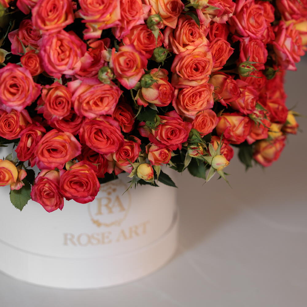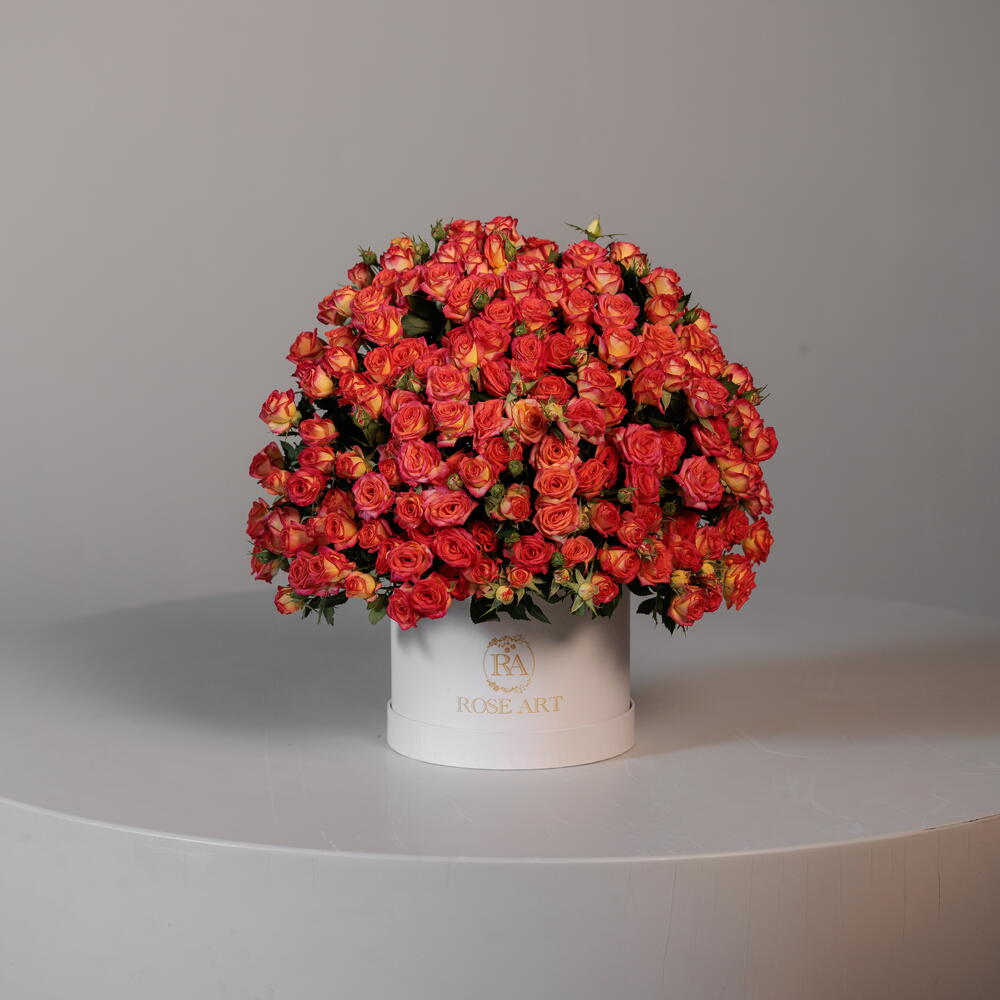 Un vibrante arreglo en caja con forma de cúpula de rosas spray Summer Dance Orange, que brillan en tonos cálidos de coral y naranja. Con sus racimos vivos y su rico juego cromático, estas flores aportan un encanto que eleva el ánimo y un espíritu festivo a cualquier ocasión.