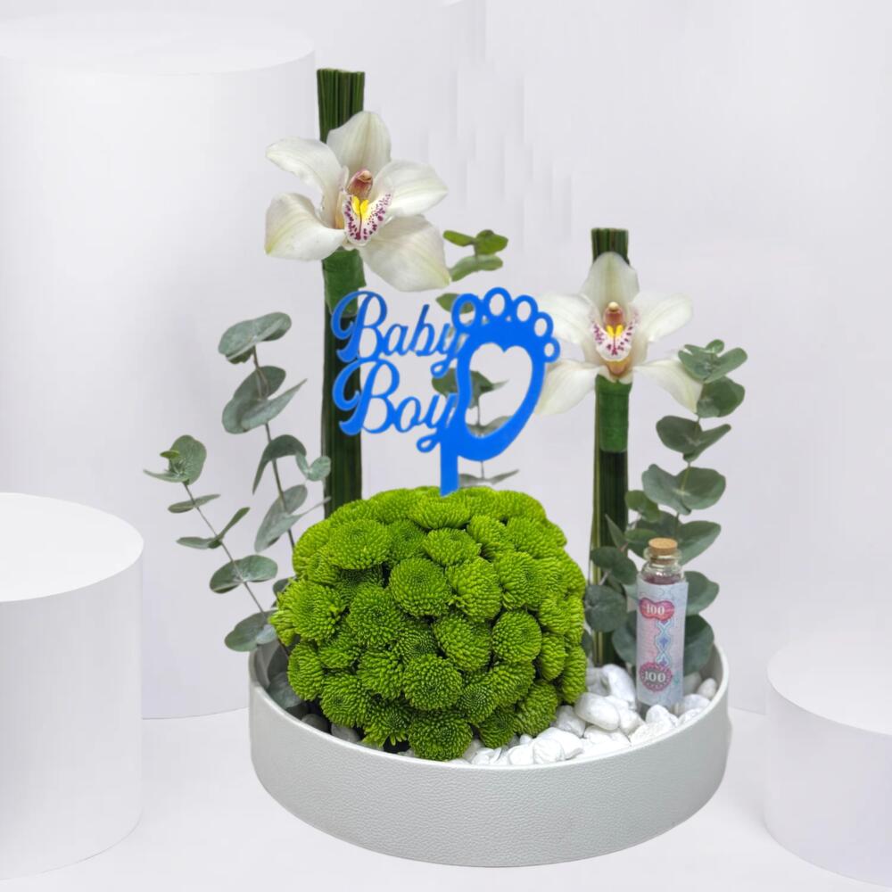 Eucalyptus - 3 ud. El crisantemo - 6 ud. cymbidium - 2 ud. bandeja redonda - 1 ud. palito para bebé varón - 1 ud.