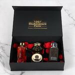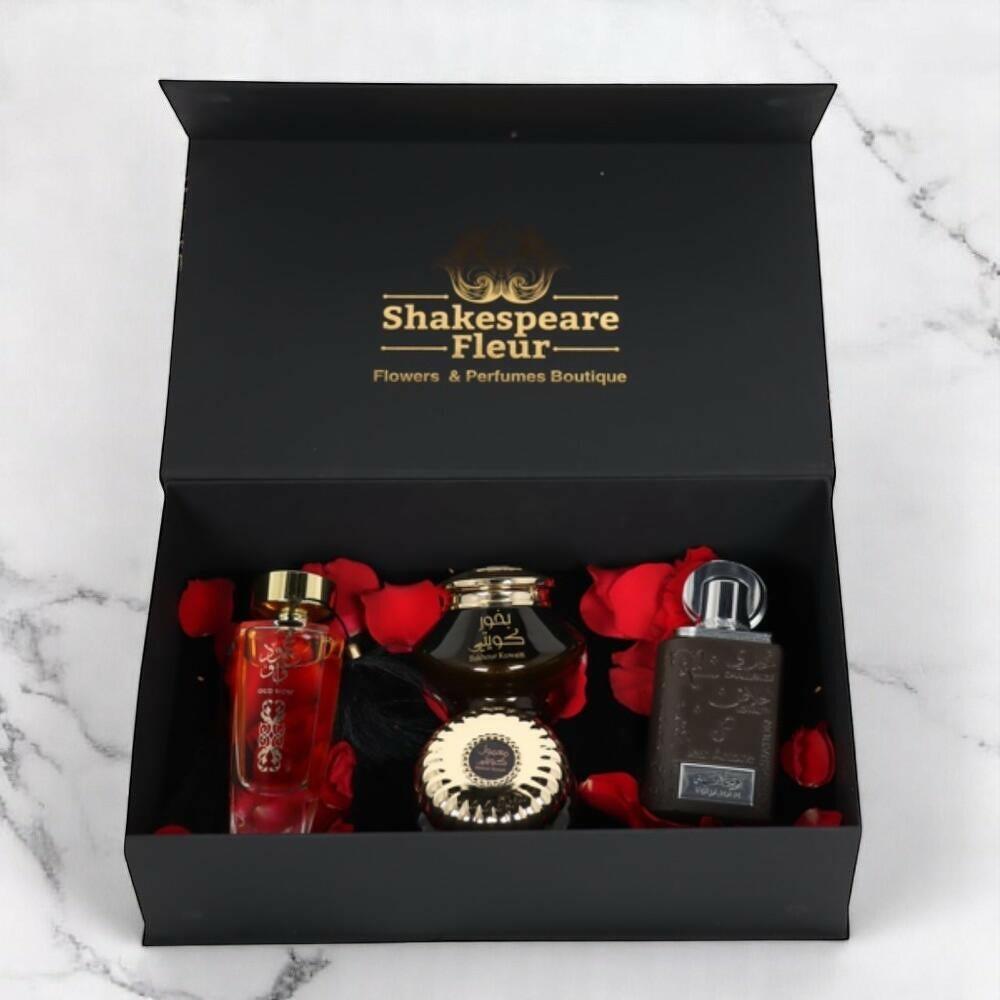 flores recién cortadas - 4 ud. shakespeare caja de flores y perfume - 1 ud. oud wow 100ml agua de perfume - 1 ud. wajahah 100ml agua de perfume - 1 ud. bakhoor kuwaití perfumado - 1 ud. maamoul kuwaití aromático - 1 ud.
