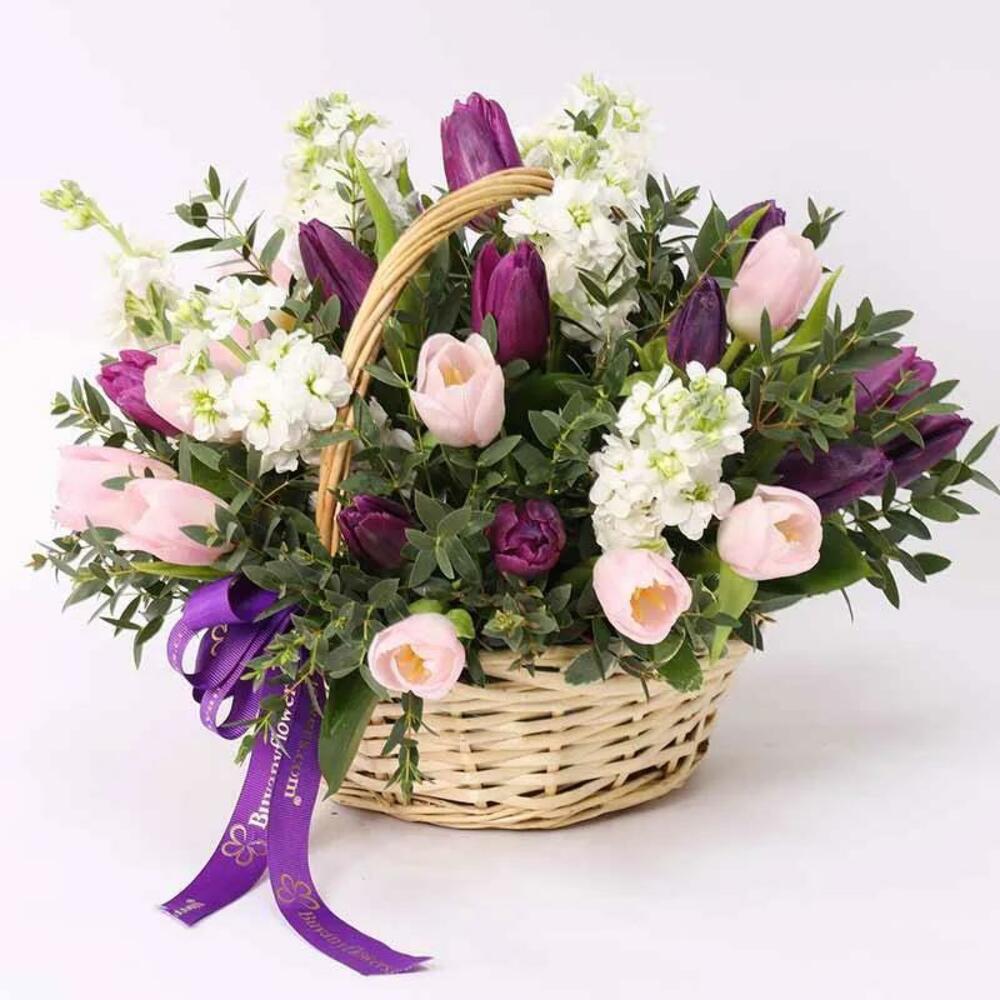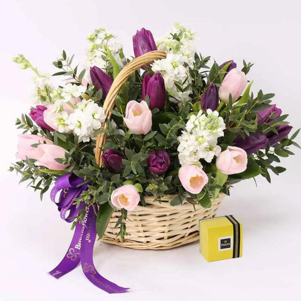 pink tulips - 10 ud. tulipanes morados - 10 ud. chocolates Patchi de lujo - 8 oz hojas de palviforia - 1 ud. alhelí blanco - 6 ud. cesta con asa y atada con un lazo de cinta - 1 ud.