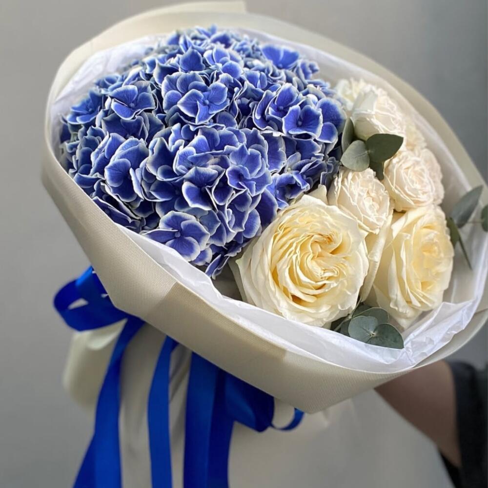 White rose - 10 ud. eucalyptus leaves - 5 ud. hortensia azul - 5 ud.