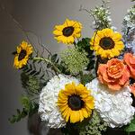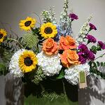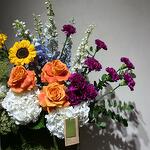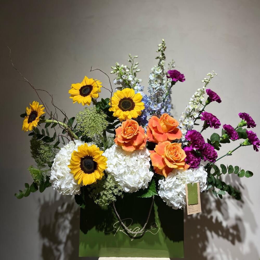 Eucalyptus - 5 ud. Hydrangea - 4 ud. Sunflower - 4 ud. rosa naranja - 4 ud. salix - 1 ud. bolsa de papel - 1 ud. claveles - 10 ud. dhelpenium azul - 4 ud.