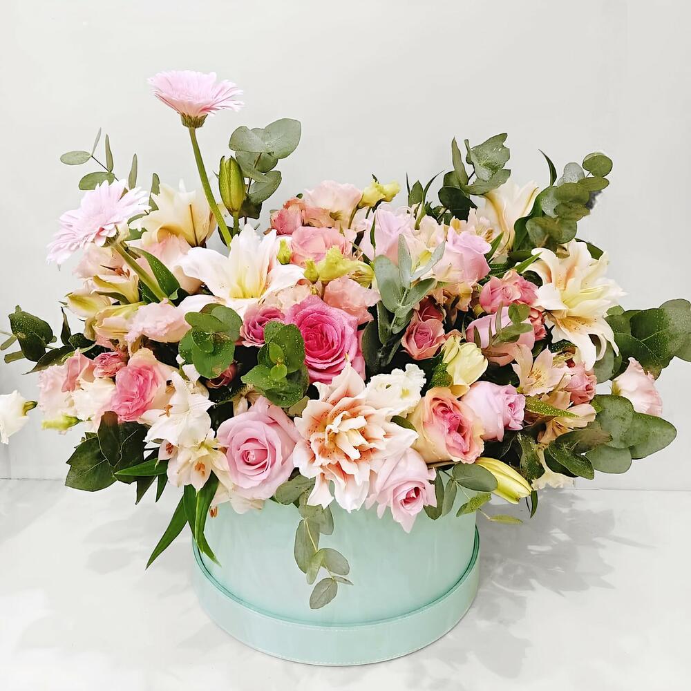Pastel Whisper es un arreglo suave y romántico lleno de tiernas flores en tonos pastel. El regalo perfecto para expresar afecto, gratitud o una admiración delicada — hermosamente dispuesto en una caja color menta claro que realza su carácter soñador.