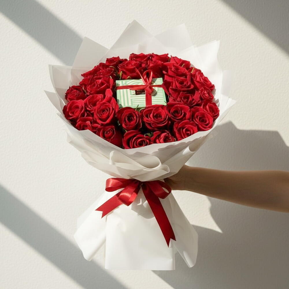 Consiéntete con la máxima expresión de amor y lujo. Este exquisito ramo incluye 30 rosas aterciopeladas de color rojo intenso, cada una un símbolo atemporal de pasión, romance y devoción. En su centro se encuentra una pieza central de chocolates Patchi premium, que combina la belleza floral con la dulzura. Perfecto para cumpleaños, aniversarios, San Valentín o cualquier momento que valga la pena celebrar, este arreglo transmite elegancia y emoción. Más que un simple regalo, es un recuerdo creado con rosas y chocolate. ✨ Por qué es especial: 30 rosas de color rojo intenso cuidadosamente seleccionadas 🌹 Bombones Patchi premium 🍫 Presentación de lujo para momentos inolvidables Ideal para ocasiones románticas: regalos de lujo 👉 Haz tu pedido ahora y derrite su corazón con chocolates florales en un gesto perfecto.