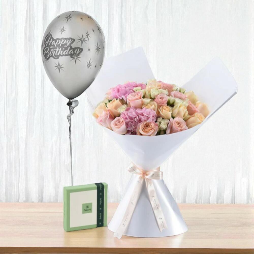 hortensias rosadas - 2 ud. rosas spray blancas - 10 ud. follaje de ruscus - 15 ud. caja de chocolates patchi - 1 ud. rosas melocotón mágicas - 11 ud. rosas rosadas con brillo - 11 ud. globo de helio “feliz cumpleaños” - 1 ud.