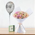 Captura la magia de las celebraciones más emotivas con el Ramo de Cumpleaños Encanto Flor de Durazno Combo de Chocolate: un elegante set de regalo diseñado para expresar amor, alegría y aprecio. Este ramo de ensueño presenta una refinada combinación de 11 Rosas Melocotón Mágicas y 11 Rosas Rosas Brillantes, delicadamente combinadas con 2 Hortensias Rosas Suaves y 10 encantadoras Rosas Blancas en Spray. Los detalles de ruscus fresco (15 tallos) aportan textura natural y elegancia, convirtiendo este arreglo en un verdadero deleite visual. El ramo está envuelto en un impecable papel floral blanco y atado con una cinta de satén color durazno para un acabado impecable y lujoso. Complementa las flores una caja premium de chocolates Patchi y un globo festivo de cumpleaños, todo cuidadosamente seleccionado para crear una experiencia de regalo completa e inolvidable.