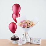 Eucalyptus - 2 ud. pastel de chocolate - 500 gr pink roses - 15 ud. rosas melocotón - 12 ud. hortensias rosa claro - 3 ud. aceite para bebé johnson’s - 1 ud. johnson’s gel corporal antibacteriano - 1 ud. toallitas para bebé johnson’s - 1 ud. globos rojos de celebración - 3 ud.