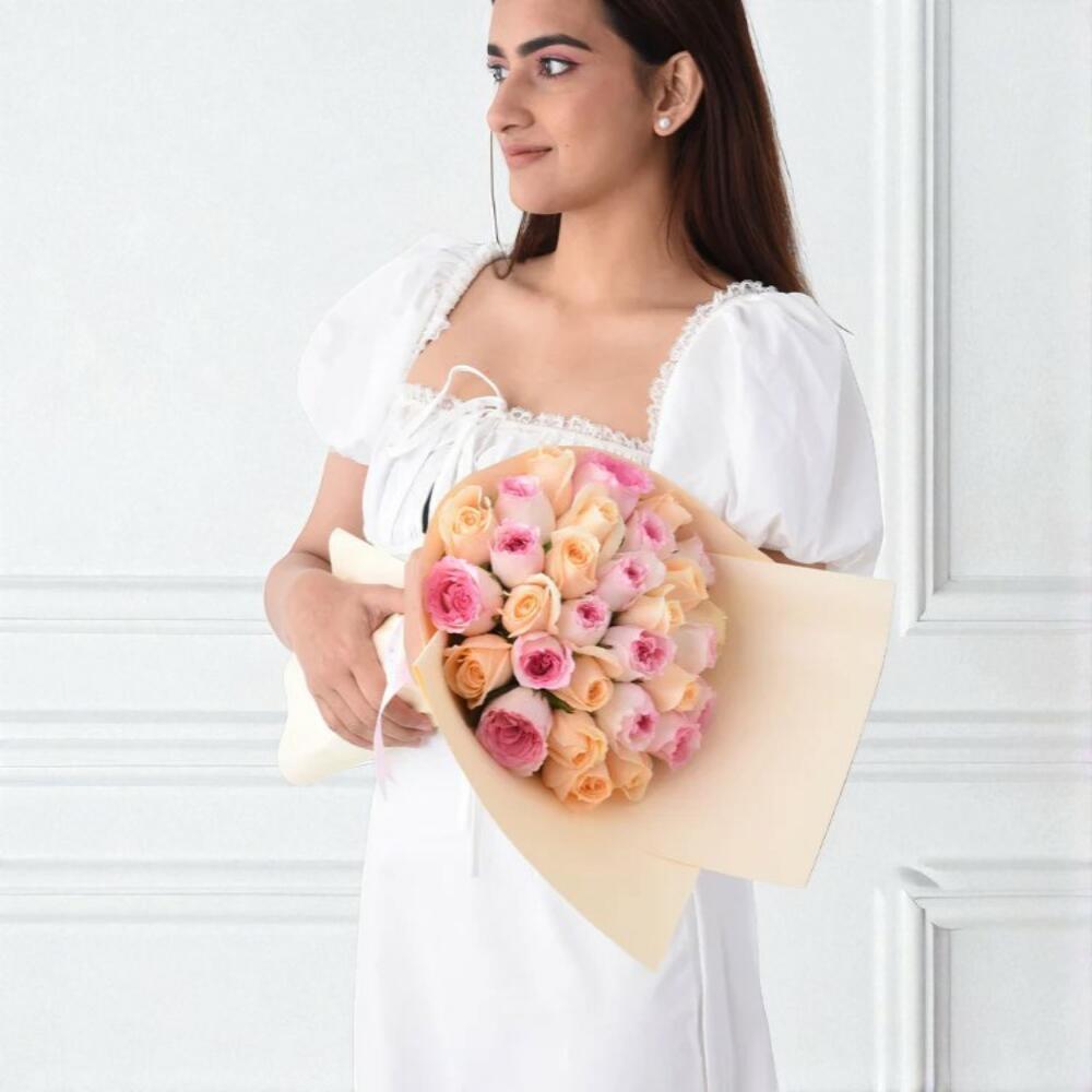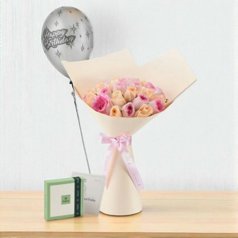 Grácil, elegante y cuidadosamente curado, el combo de cumpleaños de rosas color durazno y rosa claro es un encantador regalo floral que combina belleza delicada con dulzura indulgente. Con una romántica mezcla de 15 rosas color durazno y 15 rosas rosa claro, el ramo está envuelto a mano en papel premium de tono rubor suave y rematado con una cinta de satén rosa pastel. Este conmovedor arreglo es perfecto para expresar amor, gratitud o celebración. Para completar la experiencia, el combo incluye una caja de lujo de chocolates Patchi, un globo festivo de cumpleaños y una tarjeta de felicitación personalizable — lo que lo convierte en la sorpresa de cumpleaños todo en uno ideal.