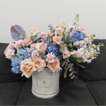 clavel rosa - 10 ud. hydrangea blue - 3 ud. matthiola pink - 8 ud. rosas melocotón - 9 ud. anturio desenfocado - 1 ud.