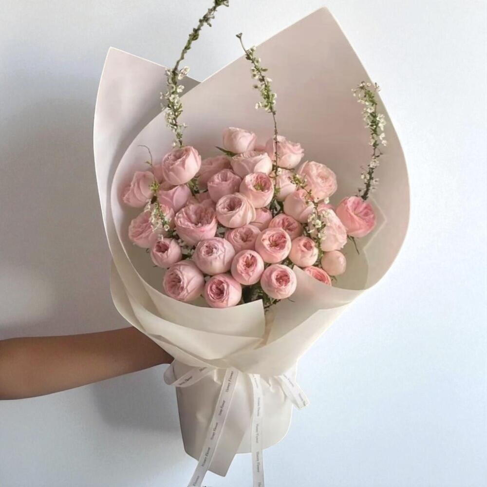 Un delicado y elegante ramo de ranúnculos rosa pálido, atado a mano, bellamente decorado con delicados rellenos blancos y envuelto en papel blanco cremoso. Este ramo refleja gracia, dulzura y un romance atemporal, perfecto para expresar amor tierno, gratitud o celebrar momentos especiales.
