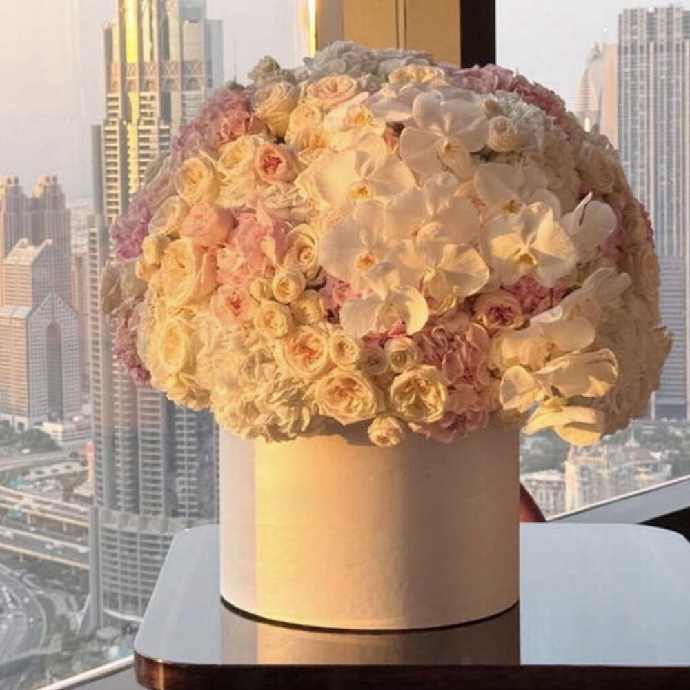 Una impresionante composición extra grande que combina exuberantes rosas de jardín, voluminosas hortensias y elegantes orquídeas phalaenopsis, presentada en una caja floral artesanal premium. Este arreglo encarna el lujo moderno, el gusto refinado y la sofisticación atemporal.