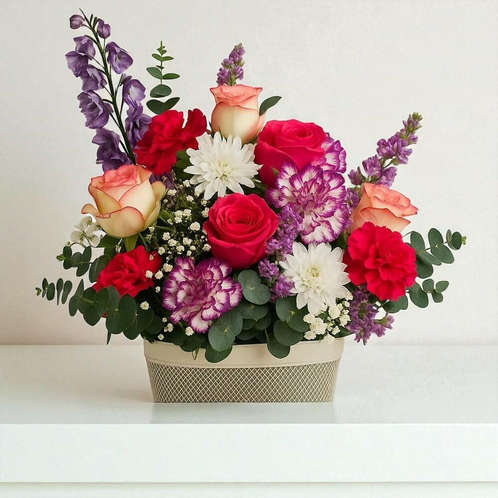 Este encantador arreglo está lleno de colores y texturas vibrantes, convirtiéndolo en una verdadera celebración de la belleza. Rosas brillantes, claveles delicados, crisantemos alegres y llamativos dianthus bicolores se complementan con ramitas de limonium y gypsophila. Toques de follaje de eucalipto aportan frescura y elegancia a la composición. Perfecto como un regalo alegre o como un centro de mesa impresionante, este arreglo en cesta aporta calidez y alegría a cualquier espacio. Para mantenerlo fresco por más tiempo, añade un poco de agua diariamente en la espuma floral y colócalo alejado de la luz solar directa y del calor.