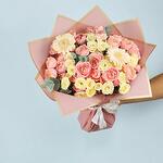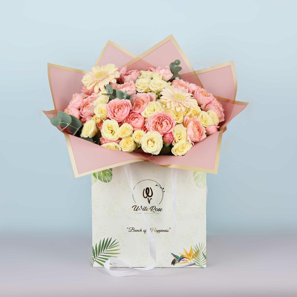 un ramo con combinación de Julietta, rosas baby, gerberas y otra mezcla de flores en una bolsa