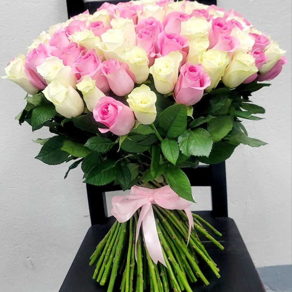 Las rosas rosadas y blancas son flores elegantes y delicadas que simbolizan el amor, la gracia y la pureza. Sus pétalos a menudo presentan un suave degradado, con tonalidades de rosa sonrojado que se mezclan con un blanco cremoso, creando un aspecto romántico y atemporal. Las flores pueden ser grandes y abundantes, con una textura aterciopelada, y a menudo se disponen en ramos para bodas, aniversarios y otras ocasiones especiales. La fragancia de las rosas rosadas y blancas suele ser dulce y floral, añadiendo a su encanto. Sus tallos verdes y hojas oscuras proporcionan un contraste llamativo, realzando su belleza.