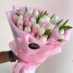 Este encantador ramo de tulipanes rosa y blancos irradia suavidad, frescura y una elegancia sutil. La delicada paleta de colores crea una impresión romántica y aireada, perfecta para expresar amor, cuidado y emociones cálidas. El suave envoltorio en tonos pastel realza la belleza natural de las flores y le da al ramo un aspecto refinado, listo para regalar. Los tulipanes están dispuestos en una forma frondosa y redondeada que resulta a la vez moderna y atemporal. Este ramo es ideal para cumpleaños, aniversarios, baby showers o como una sorpresa sincera para el día a día. Para prolongar su frescura, coloque el ramo en agua limpia y fresca, cambie el agua diariamente, recorte ligeramente los tallos cada 1–2 días y manténgalo alejado de la luz solar directa y del calor.
