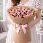10 tallos de rosas baby de color rosa suave hermosamente envueltos en papel marrón y rematados con una cinta rosa. Este suave y encantador ramo Pink Baby Kiss es un regalo perfecto para expresar amor amistad y agradecimiento