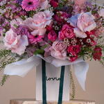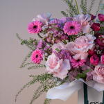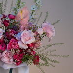 germini rosa - 3 ud. rosa fucsia - 5 ud. delphinium blanco - 2 ud. cera rosa - 5 ud. mathiola rosa - 6 ud. lipidium - 5 ud. anturio rosa - 2 ud. pink roses - 8 ud. rosa spray rosa - 5 ud.