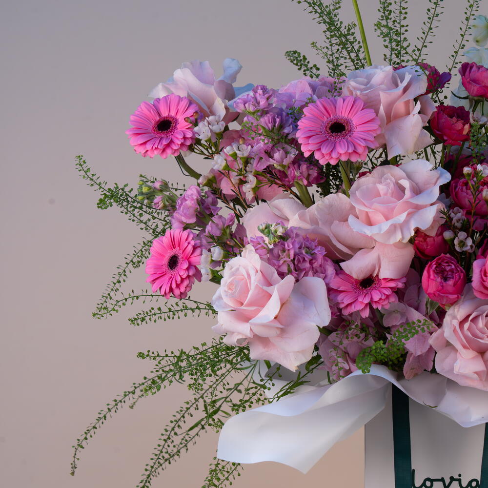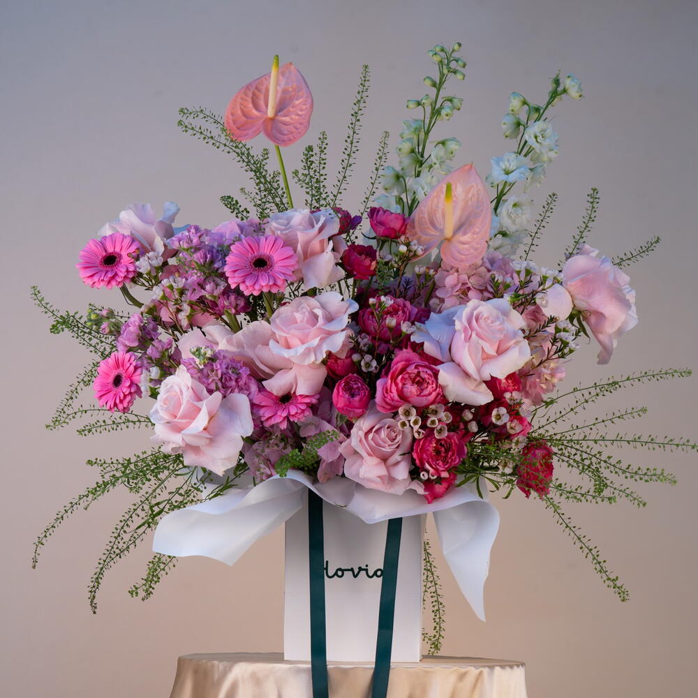 germini rosa - 3 ud. rosa fucsia - 5 ud. delphinium blanco - 2 ud. cera rosa - 5 ud. mathiola rosa - 6 ud. lipidium - 5 ud. anturio rosa - 2 ud. pink roses - 8 ud. rosa spray rosa - 5 ud.