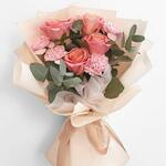 Delicado y encantador, este ramo presenta 4 rosas rosadas, 4 claveles rosados y hojas de eucalipto frescas, bellamente envuelto para un toque elegante. Perfecto para cumpleaños, aniversarios o simplemente porque sí, es un arreglo floral suave y elegante, ideal para ella.