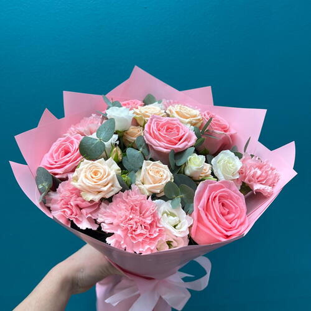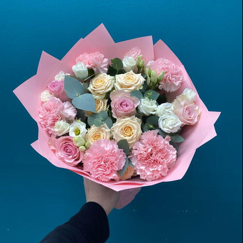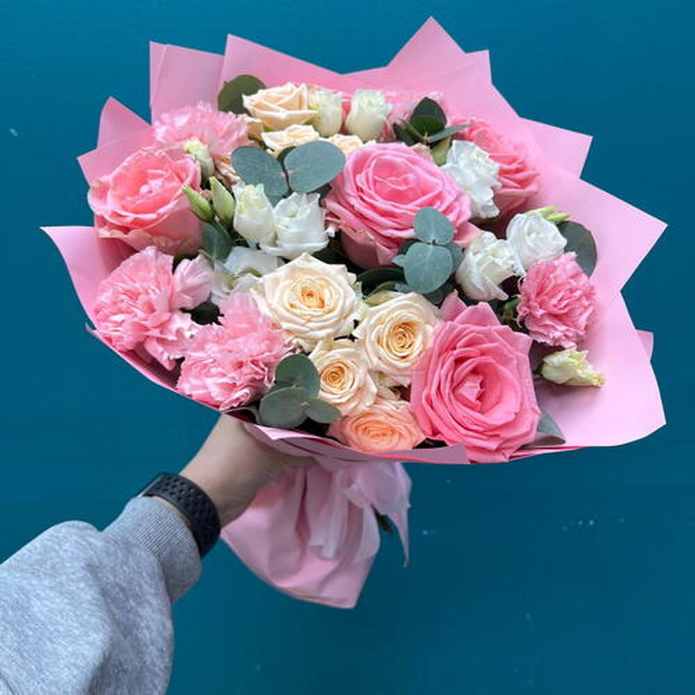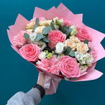 La cinta - 1 ud. Lisianthus - 3 ud. Wrapping - 5 ud. dianthus - 5 ud. pink roses - 5 ud. bush roses - 3 ud.