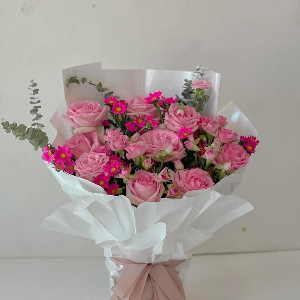 Eucalyptus - 3 ud. Pink rose - 9 ud. áster rosa - 7 ud. rosa bebé rosa - 6 ud.