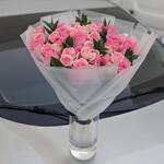 Pink rose - 20 ud. jarrón de cristal - 1 ud. ruscus leaves - 10 ud. dinara rosa spray - 10 ud.