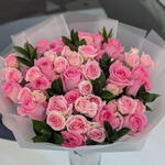 Un encantador arreglo con suaves rosas rosadas combinadas con delicadas rosas spray Dinara, creando una mezcla romántica de color y textura. Acentuado con hojas frescas de ruscus, el ramo ofrece un aspecto exuberante y natural que realza su elegancia. Dispuesto en un elegante jarrón de vidrio, este diseño aporta un toque de belleza a cualquier espacio—perfecto para regalar, para celebraciones o para alegrar tu hogar con su atractivo suave y refinado y su atemporal armonía floral.