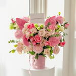 Esta elegante caja de flores ofrece una combinación perfecta de belleza y gracia, con un toque de singularidad. Presenta un exuberante conjunto de 4 anturios, un clásico de las regiones subtropicales, conocido por su brillante color y su larga duración. Esta exótica colección se acompaña de 5 crisantemos teñidos de peonía rosa claro, cada flor exuda un delicado rubor de atractivo. Para realzar la estética, se añaden 5 ramitas de eucalipto Baby Blue, que aportan un suave contraste y un aroma refrescante. Además, la caja contiene 10 flores de lisianthus rosa soleado, conocidas por sus relajantes colores pastel y que simbolizan el aprecio. Finalmente, se complementa con 10 vibrantes ópalos rosas, cada capullo intrigante que se despliega para revelar capas de encanto romántico. Esta espectacular mezcla de flores es perfecta para demostrar su afecto y cariño a un ser querido o para hacer de cualquier ocasión un recuerdo memorable.