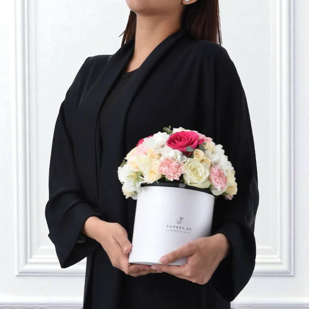 Aporta belleza atemporal y una emoción sincera a cualquier momento con la Caja Pink Floyd Ivory Elegance Bloom, un exquisito arreglo floral diseñado para cautivar e inspirar. En una elegante y redonda caja negra exclusiva de Zuvees, este ramo presenta una impactante combinación de flores de primera calidad en suaves tonos marfil, rubor, melocotón y rosa intenso, creando una composición equilibrada y lujosa, perfecta para regalar o decorar. Instrucciones de cuidado: Conserve la caja en un lugar fresco, alejado de la luz solar directa y fuentes de calor. Las flores están dispuestas en espuma floral, que debe mantenerse húmeda. Añada un poco de agua al centro del arreglo a diario para mantener su frescura. Evite colocar el arreglo debajo de un ventilador o cerca de las rejillas de ventilación del aire acondicionado para evitar que se marchite prematuramente.