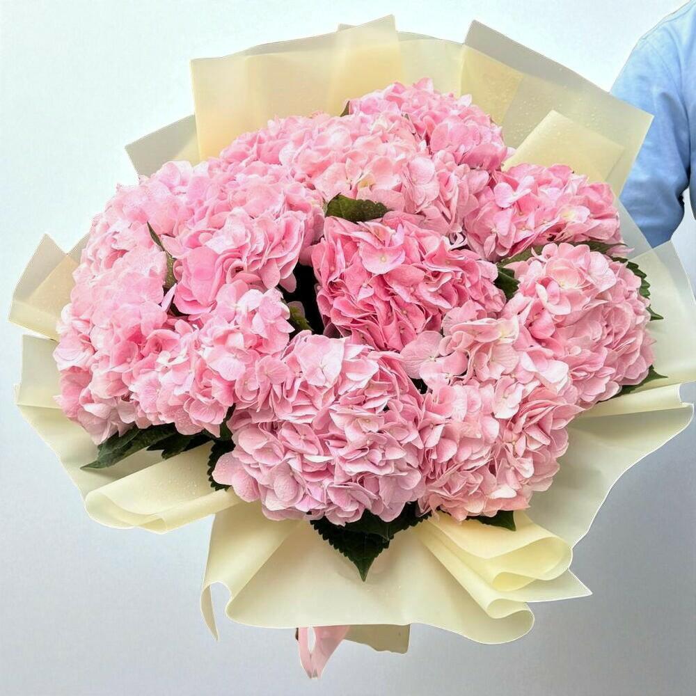 Ramo de 12 hortensias rosas con rellenos verdes, envuelto en papel y atado con lazos. El ramo Pink Elegance cuenta con 12 vibrantes hortensias rosas, bellamente complementadas por exuberantes rellenos verdes. Envuelto en papel fino y atado con elegantes lazos, este impresionante arreglo es una expresión elegante de amor y admiración, perfecto para cualquier ocasión especial.